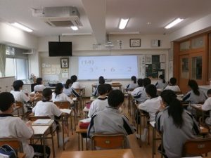 1年生数学では、最初の単元である『正の数と負の数』分野において、負の数の含まれる計算の理解や練習に取り組んでいます。符号のミスは減ってきていますが、今後も、毎授業行っている「今日の計算」や電子黒板を利用した即答計算などで練習を重ね、短時間で正確に解く力を養っていきます。(写真は、即答計算の様子です。一定の時間がたつと、映し出されている問題が切り替わるものです。)