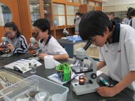 理科室を覗くと、1年生が楽しそうに顕微鏡で「淡水プランクトン」の観察を行っていました。学んだばかりの顕微鏡の使用手順に従って観察してみると、活発に動き回るいろいろな微生物たちの世界。それを実験・観察レポートにまとめていきます。こうやって基礎を学びながら、やがては予測する→実験・検証する→結論を導く、というところまで自ら行えるようになっていきます。