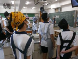 「実習」は2時間続きの授業で、社会自立を視野に入れ実生活に必要な内容を学年ごとに行ないます。2年生の1学期は調理分野を取り扱い、今回は手軽にできる”ねぎのチヂミ”を作りました。技術家庭科の教諭より作り方の説明を受けた後にグループに分かれて作業を進めます。柔らかい食材を切るときには包丁をうまくスライスさせて動かす点をポイントにしています。次回も同じレシピに取り組むことで計量カップやスプーンなどの調理器具の使い方も習得していく予定です。