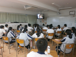 3学年の1学期の生命科単元は「平和」。「過去の事実を知る」をテーマに、ヒロシマの原爆を題材にしたビデオの後編を視聴していきました。大きく3つに分けられるという原爆による被害。それらはどのような影響をヒロシマの人々に与えたのか、原爆資料館に残された遺品から紐解いていきます。また、自身も被爆者である資料館館長の高橋さんの言葉は、今の時代の核の恐怖をずばりと言い当てています。我々が受け取らなくてはいけないメッセージとは…。また、アメリカは何故原爆投下を決断したのか…。生徒達は自身の意見をまとめることで、「平和」のためには何が大切なのか考えを深めています。
