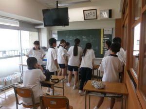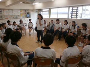 本校では生徒会組織である「友愛会」が主体となって縦割りでの活動を行い、学年を越えて友好を深めています。今日は給食を一緒に食べた後、班ごとにレクリエーションを行いました。3年生の班長が中心になって全員が楽しめる企画を考え、絵を描いてリレーするしりとりやフルーツバスケットなどのゲームを行い、それぞれ時間いっぱい楽しんでいました。