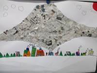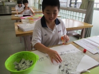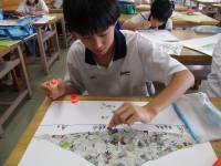 美術の授業では、新聞紙を使って富士山の絵を制作しています。はじめにペンで富士山を中心に大きく描き、そこに新聞紙を貼っていきます。適切な大きさにちぎり、1枚ずつのりを適量つけ、隙間がないように考えて貼るという作業を通して手先の巧緻性や空間認識が高まります。作業の見通しがもてると、黙々と集中して取り組む姿が印象的でした。新聞紙を貼り終えると、手前の風景を描いていきます。木立、家、建物・・・、個性が現れてくるところです。そしてさらに近景へと進みます。富士山の前に、大好きな電車を走らせてみたい、花を描いてみたい等、仕上がりを楽しみにしながら進められています。