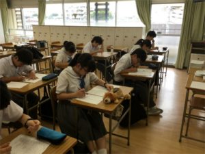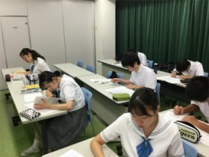 3年生対象の夏期講習全17日間が終了しました。午前、午後合わせて計4時間半を教科学習、10名程度の少人数グループで学習します。グループによって進度は違いますが、各教科単元別に復習し、基礎を固めた上で入試問題演習に取り組んできました。課題は毎日3時間分。毎日の自主学習の積み重ねが、先日の模試でも発揮できたようです。講習の前後で顔つきも一層受験生らしく変わり、今後に向けて実力と自信を高める講習となりました。