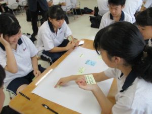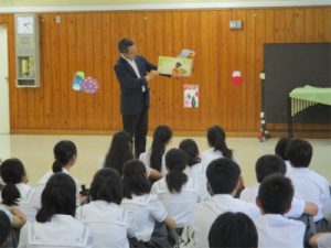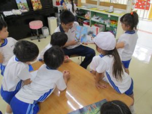 武蔵野東第一・第二幼稚園にて保育の実習をさせていただきました。今回の実習では、始めに園長先生から中学生に向けて絵本の読み聞かせがあり、それを受けて何を感じたかをグループで共有するワークショップから始まりました。園長先生の読み聞かせに対して、「感動した。」「思わず引き込まれた。」などの感想が集まると同時に、今回は自分達が園児に読み聞かせる立場であることに改めて自覚を持ったようです。ワークショップの中では感じたことを素直に表現すること、その表現を暖かく受け止めることの大切さを学び、実習へと臨んでいます。今回が最後の幼稚園実習となりましたが、園児たちから多くのエネルギーと学びを受けることができました。
