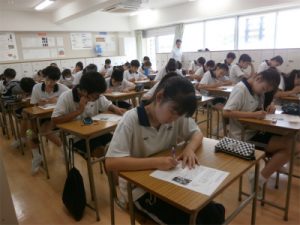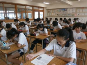 国際理解の5回目は、フィリピンの貧困に悩む状況を伝えるドキュメンタリー番組を題材にしました。その番組に登場した14歳の少女(マニカ)はゴミ山から空き缶やビニールを拾い、換金して一家を支えていました。自分たちの日本での生活ぶりや物事の考え方についてマニカのそれとの違いについて考えていきました。