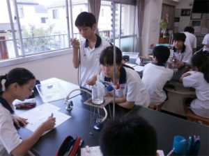 1年生の理科では状態変化についての学習を行っています。今回は化粧品やろうに多く含まれるパルミチン酸という脂肪の融点を測定しました。30秒ごとに時間を計測する人、温度を読む人、結果を記録する人など作業を上手に分担して実験を進めていました。次回は結果をグラフ化し考察を行う予定です。