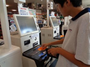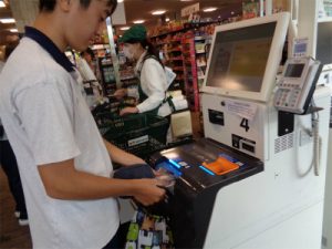 今回は、近隣のスーパーに行ってセルフレジの体験を行いました。事前にセルフレジとはどんなものか画像を見せながら手順も含めて説明しています。レジ係の人に品物のバーコードをスキャンしてもらってから指示されたレジ機の所に行くことは、初めての生徒にとっては戸惑いが見られました。機械の番号をよく確認することが必要です。また家庭の買い物で経験している生徒でも機械に硬貨を1枚ずつ投入し時間がかかったり、紙幣を横向きに入れることに慣れていない生徒もいました。実際に利用して身につくことも多いので、硬貨は数枚まとめて入れられることなど再度確認して次回に生かしたいと思っています。