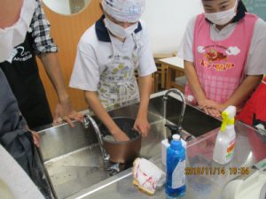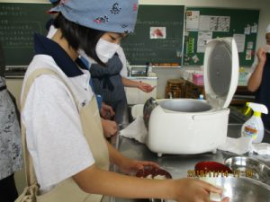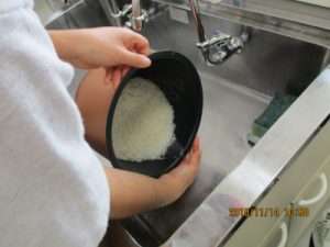 調理実習でおにぎりを作りました。今回の目標は、①お米の炊き方を覚える、②ラップの切り方をマスターする、③力加減を調節しながらおにぎりを三角形に握る、でした。米を研ぎ、水を入れて炊飯器にセットするところから実習スタート。研ぎ汁を流す時に米がこぼれないように気を付けました。おにぎりは、お椀にラップを敷いた中にご飯を入れ、包んでから握りました。「三角形にふんわり」というのは難しいようで、まだまだ練習が必要です。次の調理も「おにぎり作り」に取り組みます。手の使い方や握り方を復習して臨みたいです。