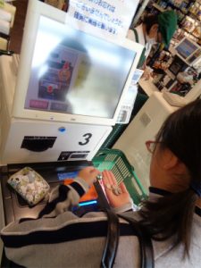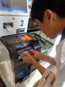 今回の体験学習は、前回に続き、近隣のスーパーに行ってセルフレジの使い方を確認しました。セルフレジのメリットとして「店側は会計の時間を短縮でき、利用者が自分のペースで精算できる」ということがあります。しかし、精算機の数には限りがあり、会計を済ませた買い物客に待ちがでないよう精算を手短に終えることは必要なことで、前回の反省点もふまえお金を1枚ずつではなく、まとめて投入するよう話をしてきました。今日は、¥267であれば、300円投入するなど概数の金額でスムーズに精算を済ませる生徒が先日よりも多く見られたのはよかったと思います。ただ、持ってきたお金をすべて投入するなどの生徒もいたので、大よそ合計額に見合った金額を投入できることが今後の課題です。