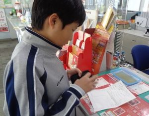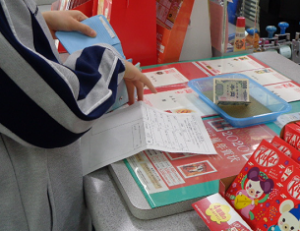 今回の体験では、郵便局に赴いて年賀ハガキや切手等の買い物を行いました。ドラッグストアやスーパーとは異なり、買いたい商品や枚数を口頭で伝え、郵便局の方と受け答えをしながら買い物を行うのです。事前に家庭で記入してきたプリントを元に、注文の仕方や受け答えを学校で行ったことでスムーズに行えたと思います。今後は順番待ち時のマナーやお金の支払い方など、細かいところまでアドバイスしていきます。