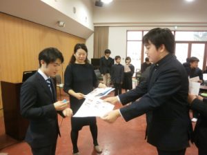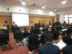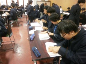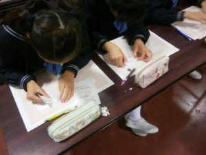 今回はオリックス業務支援株式会社の方々をお招きし「職場作業体験」というテーマで講座を開きました。内容として、映像を使って会社説明や仕事紹介のお話をいただいたり、東中卒業生の社員の方からの発表もあり貴重な講演になりました。また作業体験ではビジネスマナーとしての挨拶の仕方、ラベル貼り、紙の二つ折り、スタンプ押し、マーカー引きの作業に取り組んでいます。このような経験や講師の方々また先輩のお話に触れて、職業(仕事)に対する意識をより高める良い機会になりました。