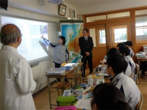 中部地方の気候に大きな影響を与える季節風。この季節風が吹くのはなぜか?この疑問に対して、理科の気象分野の知識を活用して答えを導き出します。授業では夏と冬それぞれの天気図と衛星写真から読み取れることをペア活動で話し合いました。「冬の天気図は西高東低だから…」「夏は太平洋側に小笠原気団があるから…」「風は高気圧から低気圧に向かって吹くから…」「等圧線が狭いと…」などさまざまな意見が交わされ、季節風が吹く理由を解き明かしていきます。なぜ冬はずっと冬型の気圧配置が続くのか?といった発展的な内容にも踏み込み、社会科と理科のコラボ授業は深い学びの時間となったようです。