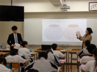 技術分野の「製図」(キャビネット図・等角図)のきまりに従って図形を描くことで、数学の「空間図形」の見方や考え方のヒントを得ることができています。授業の最後には難しい問題も出題しましたが、クラスメイトとアイディアを出し合い、楽しみながら製図を完成させることができました。