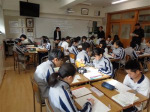 武蔵野東中学校では、共通するテーマについて複数の教科を通じて理解を深める、教科横断型の授業を実施しています。国語科と英語科のコラボとして、日本語の「主語・述語の関係」、英語の「be動詞、一般動詞」に注目し、それぞれの文法の比較をしました。両者を併せて理解することで、英訳・日本語訳をスムーズに行うことが目標です。グループで話し合いながら適切な表現を見つけていくことで、生徒たちは文構造や状況に応じた2つの言語の使い方を見直すことができたようです。