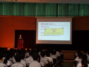 2年生の探究科で優秀賞を受賞した生徒によるプレゼンテーションが行われました。「売り上げをUPさせる曲の創作」、「興行収入の高い映画についての分析」、「交通事故と心理的要因の関係」、「きれいな文章とは何か」といった、様々なテーマについての発表となりました。どれも聞き応えのある内容で、アンケートやグラフなどの多くの資料や分析から導き出された結論があり、生徒からは感嘆の声があがりました。発表者も人前で伝えたことで、自分の探究をより深めることができたようです。この発表を、1年生は個人探究のアイディアを広げる材料とし、2年生は各クラスで行うプレゼンテーションの参考にして、今後も探究科を進めていきます。