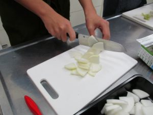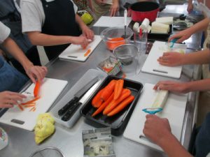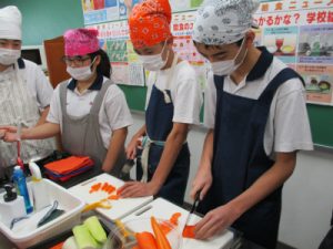 調理実習も回数を重ね、身支度などの準備が手早く行えるようになりました。包丁とピーラーの使用については、「検定」を設け、目標をもって取り組めるようになっています。今回は、ニンジンと大根の皮をむき、それぞれ半月切りとイチョウ切りにしました。皮をむいても色が変わらない野菜は、むき残しがないかを確認することがポイントです。包丁で切る時の幅は、今のところ5mmを基準に同じ厚さで切るよう練習しています。調理実習をきっかけに、家庭でも料理の手伝いをするようになった生徒もたくさんいるようです。生きる上で欠かせない「食事」。これからも技術や知識を身につけていくようにしたいものです。