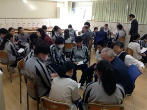 1年生AB組では、来日しているボストン東スクールの皆さんとの交流授業を行いました。1人ずつグループに入っていただき、生徒たちは自己紹介をした後、用意していた質問を投げかけ会話を楽しみました。好きなスポーツや日本のお気に入りの場所、さらにはボストンのことなど様々な質問をし、生徒は返ってくる英語の答えに熱心に耳を傾けていました。また話題は日本の文化や食べ物にも及び、ある生徒はお好み焼きについて、語彙を駆使して説明するなど、積極的にコミュニケーションをとろうとする様子も見られました。
