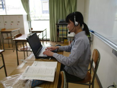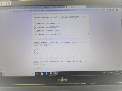家庭と学校をつなぐ学習が進行しています。授業動画とともに、『classroom』で担任が出席をとる代わりに質問をしたり、教科の先生が問題を出したりすると、待ちわびたように生徒たちから回答が返ってきます。家庭にいながら学校で友達と一緒に活動しているような感じができてきました。画像は、授業動画を作成中の先生と配信された問題の例です。