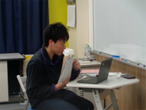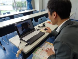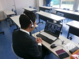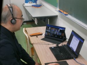 中学3年生の高校進学に向けた『特別進学学習:通称“特進”』がスタートしました。『特進』は、放課後に約10名の小グループで行う開校以来の進学指導の柱です。もともと授業も少人数指導ですが、さらに絞った少人数で基礎固めから入試問題演習まで行っていきます。今般の状況下、行ったのはMeetというアプリを使って、家庭にいる生徒と学校の先生が双方向の同時通信で授業を進める方法です。解き方のポイントや課題のやり方について、早速密度の濃い授業が行われていました。画像は画面に映った生徒たちの表情を見ながら、各教室でいろいろなやり取りをしている全6グループの先生の様子です。