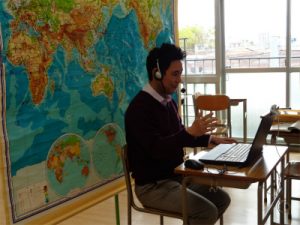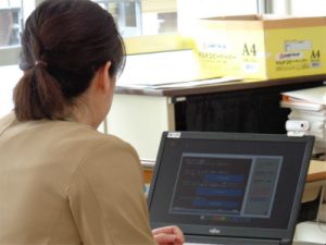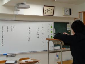 動画による配信授業が軌道に乗ってきました。生徒には事前に時間割と単元が配信され、それをもとに学年ごとその日の授業を配信しています。生徒は、朝、まずClassroomというアプリを使って、その日の出席代わりに担任の先生から送られるクエスチョンに答え、その日の学習が始まります。その後、時間割に合わせて動画授業を見て学習を進めています。動画を作る側の教員も徐々に慣れてきて、PC画面の向こう側にいる生徒たちに語りかける言葉や表情にも工夫やゆとりがみられるようになっています。画像は画面に向かって語りかたり、画面構成を考えて準備をする教員の様子です。