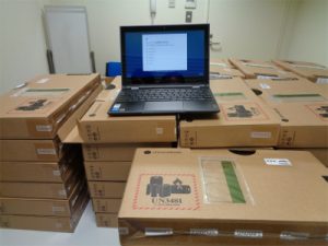 Chromebook65台が届きました。これによって1人1台のPC環境が大きく前進しました。無線LANを使ってどの教室からもネット環境にアクセスでき、電子黒板と連動した学習が進むようになります。すでに個人アカウントを利用して、動画授業や双方向通信による課題のやり取りを遠隔で行っているおかげで、教員も生徒も使用スキルがどんどんアップしています。これを機会にさらに思考力を伸ばし、訴求力を鍛える学習を進めていきます。画像はまだ梱包されている状態で平積みされたChromebookです。