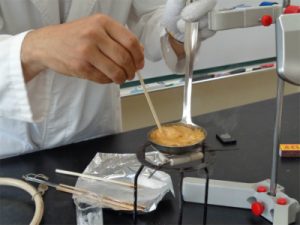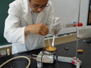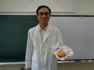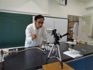 2階理科室から、カラメルのような良いにおいがします。覗いてみると2年生の単元:化合物「炭酸水素ナトリウムの分離」の応用実験として、熱して溶かした砂糖がある温度に達したときに「炭酸水素ナトリウム=重曹」を加え「カルメ焼き」を作る授業動画の作成をしていました。温度とタイミングが難しい作業ですが、先生はまるでYouTubeに投稿している料理人のように解説を加えながら、カルメ焼きを完成させていました。自宅でもトライしてもらいたい実験です。