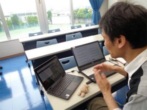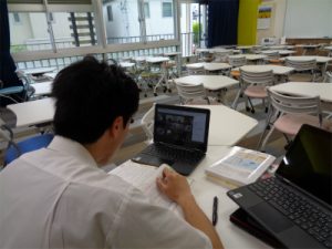3年生の進学指導の柱、「特別進学学習=通称“特進”」が、Meetを使ったオンラインで始まってから5週目に入りました。約10人のグループで、英・数・国の3科の入試に向けた学習を行っています。今回のぞいてみると担当の先生が出した課題について指名された人が答えたり、難しい問題に対して素直に「ここが難しい」といった反応があったりと学校にいるときと変わらないような雰囲気でした。中には2台のPCを用意し、メンバーの表情が常に見えるようにした状態で、学習内容の写し出しをしているグループもあり、それぞれ特色が発揮されています。先生の個性が浸透すると、次はメンバーの個性も徐々にわかってくるようになり、それが他の人の刺激になるという良いサイクルが生まれつつあります。
