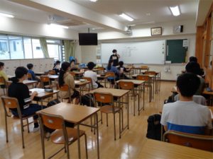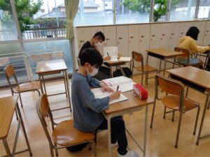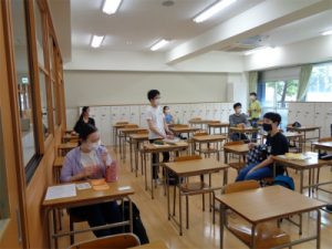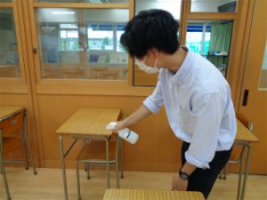 来週からの学校再開に向け、今日から学年分散による自由登校が始まりました。午前に3AB組、午後に1AB組が登校しました。登校するとすぐ手洗いと消毒を行い、教室でも間隔をとっての活動でしたが、3年の生徒たちは久しぶりの再会がやはりうれしそうでしたし、この間に身長が随分伸び、顔つきもしっかりとしてきたように感じました。入学式以来の登校となった1年生は、学校に慣れるよう改めて自己紹介やこの期間の学習の確認、担任の先生との懇談などを行いました。生徒下校後は使用した場所を念入りに先生たちが消毒しています。