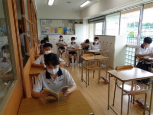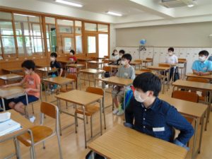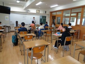 今日は、午前中に1~3年CDE組、午後に2年AB組の自由登校日でした。もちろん十分な手洗いをして教室へ入りスタート。特に1年CDE組の生徒は、入学式以来の学校ではじめはかなり緊張感がありましたが、自己紹介などをするうちにほぐれ、笑顔で語らう様子が見られました。2年AB組の生徒も教室の間隔のあいた座席にやや戸惑いがちでしたが、友達と一緒にいるという安心感から明るい表情で過ごしていました。休校期間中はMeetなどを使って互いの様子は知ることができたものの、やはりこうして一緒の空間でいろいろなことを共有できることというのは生徒たちにとって格別なことだと実感できる自由登校日でした。