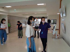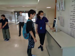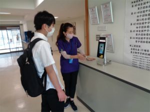 来週からの授業再開に向けて、感染防止のための対策も進んでいます。手洗いや消毒、換気の徹底に加え、登校時に体温を測るための顔認証付き検温器が到着。分散自由登校日の今日、1年生と2年生が試しました。来週の登校時からフル稼働してもらいます。