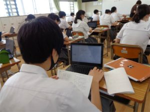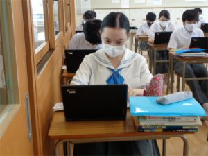 今週は午前授業の形でしたが、生徒たちは元気に登校し、少しずつ学校生活のリズムが整ってきました。2日と3日には休校中の自宅学習期間に学んだことの確認テストが行われ、その後の4日5日の授業ではその復習を行っていました。グーグルのclassroomを使って、自宅と学校をオンラインでつないで学習を行ってきたスキルを活かし、再確認問題を行っている教科もありました。画像はChromebookを使って再確認問題をその場で提出している授業などの様子です。
