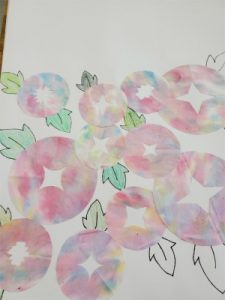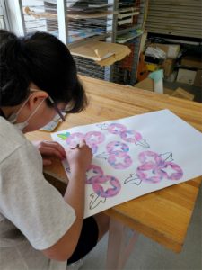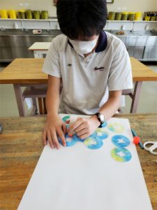 前回の美術で染めた和紙を丸く切り抜き、朝顔の形にして画用紙に貼りました。柔らかで個性的な花がたくさん並び、とても夏らしい雰囲気の絵になってきています。次は、花の周りに葉を描き、遠景も描き加えていく予定です。3年生らしく葉の色を混色で仕上げたり、背景に好きな電車を走らせたり、絵を描く楽しさを味わいながら伸び伸びと取り組んでいます。
