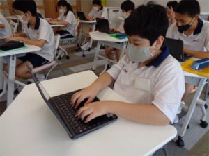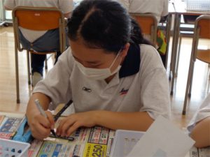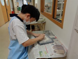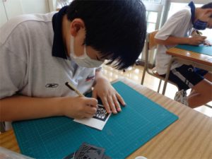 CDEクラスでは、週に2回、2時間続きの技能の時間があります。教科の授業とは少し違って、1年生から3年生までの縦割りで活動を行い、実際に手を動かして何かを作ったり、技術を高めたりすることができるので、生徒たちがとても楽しみにしている時間です。中学校で取り組める技能は、「絵画」「クラフト」「PC」「器楽」「陶芸」「切り絵」「手芸」の7つで、そこから1つを選んで1年間続けます。見学・体験をしていた1年生もそれぞれの所属する技能が決まり、今日から正式にスタート。やや緊張した面持ちで真剣に臨めている様子でした。上級生が優しく教える姿も見られ、後輩の良いお手本になっているようです。