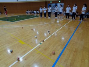 生命科で福祉の単元を学習している2年生では、パラスポーツの1つである、ボッチャに挑戦しました。試合の様子や競技のルールを学んだ後、ボールを手作りし、練習を行いました。いざやってみると、コントロールや投げる強さなどが意外に難しいことに気づき、チームで話し合う様子もありました。試合では良い投球に声援を送ったり、作戦を練りながらゲームを進めたりすることもできたようです。クラスの交流が深まっただけでなく、障がいの有無に関わらず、ともにスポーツを楽しめることを経験した時間でした。