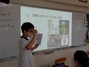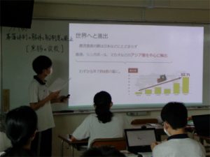 2年生の社会科では先週から、毎時間の授業で一人ずつ、冒頭の約5分間を使って教科書に載っている小さな情報について個人で探究したことを発表する「My Quest」がスタートしました。これは、主体的で深い学びを目ざした取り組みで、発表を聞く側の生徒たちもルーブリック形式で友人の探究発表を評価するという点で相互に学べる企画となっています。生徒たちがこれまで取り上げたテーマは、「北九州エコタウン」「黒豚の放牧」「日米貿易摩擦」「大雨による洪水の被害を受ける商店街(京都府)」「中国風の踊りが見られる長崎くんち」など実に様々です。今後も生徒全員がこの「小さな疑問」を「徹底調査」して発表をしていきます。