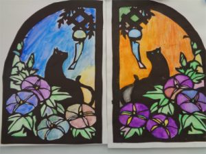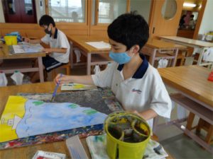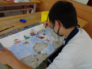 技能の絵画や切り絵では現在「夏の風物」を題材にした作品づくりに取り組んでいます。「朝顔」「向日葵」「海」「金魚」などです。その時々の季節や行事にちなんだものを作ることによって、完成に向けての楽しみが増したり、行事への期待感を多角的に味わったりすることができます。