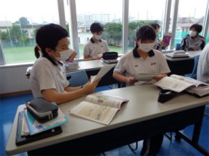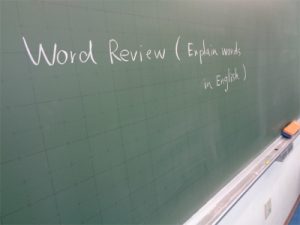 2年英語EEコース(特別コース)で行われていたのが、Word Review です。これは“Explain words in English”という副題が示す通り、生徒自身が選んだ複数の単語をチーム内の人に英語で説明し、相手はその単語は何かをあてるという内容です。ハードルの高い内容ながら、楽しみつつ一生懸命に伝えようとし合う活発な授業でした。