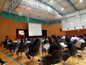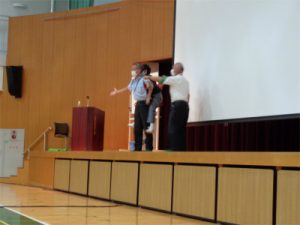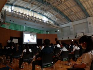小金井警察署少年係の方をお招きし、「防犯安全教室」を行いました。オンラインゲームに関わるネット犯罪の事例を紹介するDVDを見て、ネットやスマートフォンの適切な使い方について学びました。ゲーム上であっても不正アクセスは犯罪であるということが改めて確認できたようです。そして今回は、不審者に遭遇した時の対処法をいくつかの資料をもとに教えていただいただけでなく、自然災害に備えた準備や、リュックサックを使ったけが人の運搬方法についても説明していただきました。今回学んだ内容を、今後の生活に活かせると良いと思います。