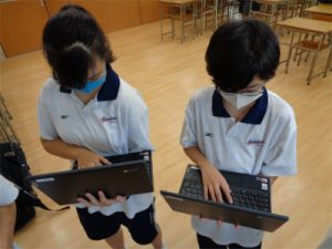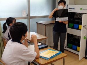 Chromebookとその充電保管庫が全ABクラスに設置されました。このPCは学校から生徒一人ひとりに貸与されるもので、これにより全員が専用Chromebookを使用できるようになりました。これを1年生のクラスでお披露目をしたところ、歓声と拍手が起こっていました。早速手に取ってログインしてみる生徒もいて、大いに学びの可能性が広がっていくものと期待しています。