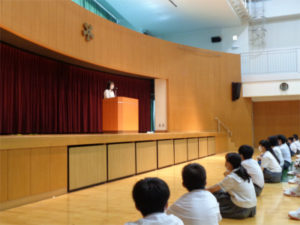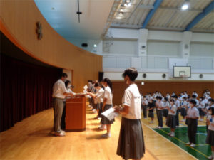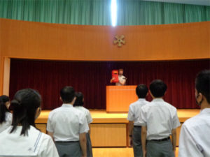 生徒たちの明るい声とともに、2学期がスタートしました。登校すると、久しぶりに会う仲間と笑顔で談笑したり、課題などを提出する姿が見られました。始業式では、校長先生から、いろいろな経験をする中から何に気づくかがとても大切であること、2学期にはいろいろな行事などを自分たちの力で作り上げていってほしい、という話があり、生徒たちも意欲を新たにしたようです。また、ALTのビル先生が作ったコミュニケーションポスト(英語の手紙をやり取りできるポスト)の紹介や陸上競技部の大会での表彰があると、拍手が起きていました。