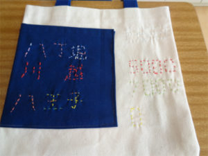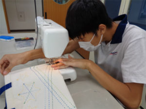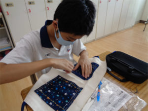 今日の実習被服は、「トートバッグの仕上げ」でした。1学期に刺し子で模様をつけたバッグのミシンがけを行います。ポケット部分の縫い付けとバッグ本体の脇縫いを行い、裏返して形を整え、アイロンをかけて完成です。ミシン、アイロンともに回数を重ねるうちに自信をもって使えるようになり、安全面に気を付けつつ一人で作業できる生徒が増えました。デザインも多様で個性豊かな作品に仕上がりました。