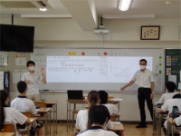 本校では、共通のテーマを複数の教科にまたがって学ぶ教科横断型の授業を実施しています。今日は理科と数学科のコラボで、化学変化と質量の関係についてグラフから関係性を読み取ることで、数学で学習してきた比例定数がこの実験ではどのような意味を持つかを考えることができました。さらに、授業の最後には実験結果から計算した値を用いて、化学式を導きだす発展的な内容まで触れています。
