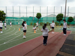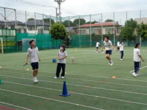 スポーツ大会の練習がたけなわです。スポーツ大会は赤・白・緑の3チームが優勝を目指して競い合います。今、友愛会(生徒会)の「スポーツ推進委員会」が全校を巻き込んで進めているのが、「縄跳び推進プロジェクト」=略称『なわすい』です。全員参加の種目で、学年ごと決められた時間を跳びきると一人一点が入る競技です。『なわすい』は学年のペアの生徒が誘い合って練習をしよう、というもので、朝の登校後や昼休み等を使っての練習がさかんになっています。『なわすい』をはじめ、いたるところで生徒たちの自主的な動きが見られ、本番に向け盛り上がってきました。