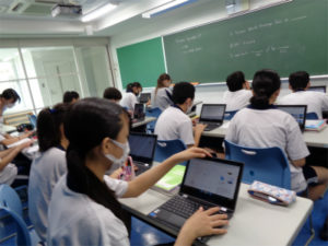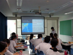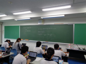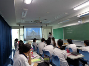 2年生の英語の授業で、世界遺産を扱った単元の応用編として、生徒各自がいろいろな世界遺産を調査し、PCで資料を作って英語でプレゼンテーションをするという授業がありました。英語で話すことにも慣れてきた様子で身振り手振りを交えてのプレゼンに笑いも起きていました。画像は前の時間の準備と当日の様子です。