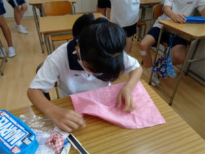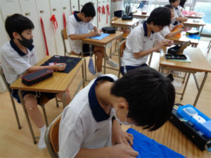実習は2時間続きの授業で、社会自立を視野に入れ、実生活に必要な内容を学年ごとに行います。今回は1学期から制作している布巾の仕上げを行い、完成させました。時間をかけて制作したので、縫い幅を細かくしたり、凝ったデザインに挑戦したりと、それぞれ個性がよく表れた作品に仕上がりました。
