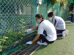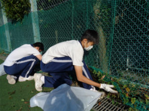 今朝は、今年度初めての「チョボラ」の活動が行われました。「チョボラ」とは、「ちょこっとボランティア」の略で、有志による活動の一つです。昨年度までは、ボランティア推進委員会が中心となって美化活動や老人ホームの訪問をしていましたが、今回は学校生活推進委員会が企画しています。委員からの呼びかけに応えて、1年生から3年生までの有志約30名が校庭に集まり、フェンス脇の除草を行いました。学校が綺麗になると気持ちがよい!活動を終え、清々しい表情で教室に戻っていきました。