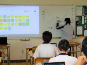 公民分野では経済分野の学習が本格化しています。今回の授業は、日によってホテルの宿泊料金が変化することをホテルのHPで調査することで始まりました。なぜ変わるかという疑問を、需要と供給のシステムを学ぶことによって解決しました。次は応用です。需要と供給のバランスで価格が大きく変わる例を全員で考え、各自がChromebookを使ってGoogleのJamboardに書き込みます。マスク、さんま、クリスマスケーキetc。その中のいくつかを各自で説明できるようにしてからノートにまとめました。写真は野菜が豊作になった時の価格の変化を説明している様子です。