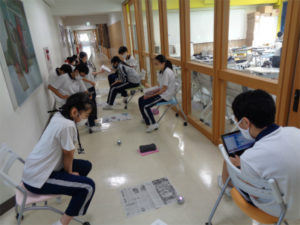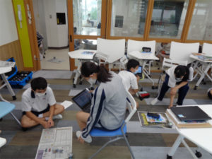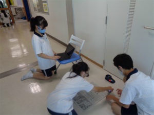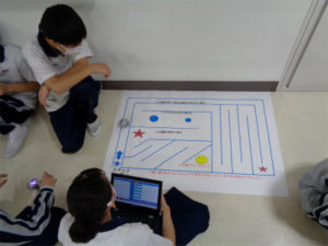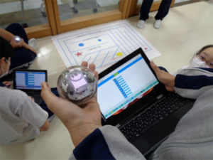 現在、技術分野でロボットボールを動かすブロックプログラミングを行っています。昨年は同じロボットボールで「四角い軌道を走るプログラム」に挑戦しましたが、今年度はもう少し細かいプログラミングに挑戦するために準備をしているところです。まず新聞紙の4辺を活用し、一定の距離を動かすための速度や角度を動かすプログラミングを導き出します。他にも音を出す、色を変える、スピンさせるにはどうしたらよいのか等、2~3人のグループでアイディアを出し合いながらプログラムを完成させました 。さらにここまでのプログラムを駆使し、大きな用紙に引かれたコースをクリアするプログラミングを考え、取り組んでいます。