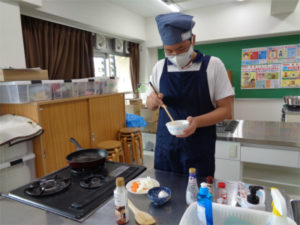 調理のクラスは「チャーハン」を作りました。野菜を切るところから、調理器具・材料・調味料を揃え、事前の説明通りに炒め、盛り付けをし、使った器具を洗って片づけるところまで全て一人で行っています。一つ一つの作業はできても、一連の流れとして見通しをもって行うには日頃の積み重ねが大事になってきます。