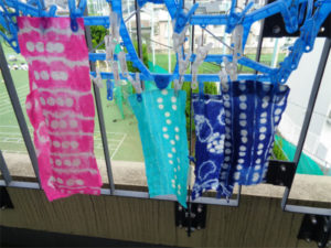 被服のクラスは「染色」を行いました。道具を使った絞り染めの準備をしたものを染色液に漬け、指示通りに洗い、道具を外します。染め上がって初めて模様が明らかになるのが絞り染めの楽しみの一つ。よく集中して取り組めていました。